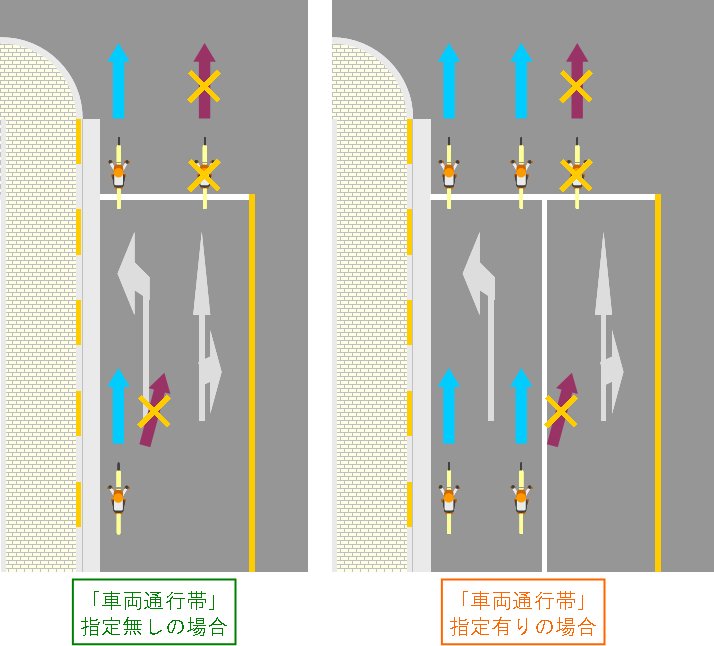 これは右折だけでなく、 直進も同じ です。 ですが、2段階右折は良いとして、 「自転車横断帯を通る」というのは疑問 に思いませんか。 車道を走っている自転車が、 「進路. 例えば、 直進する場合は左折専用レーンであっても一番左のレーンを通って直進する ことになります。 注意してほしいのが 右折専用の矢印は適用されない という点です。 自.